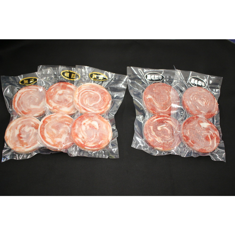 国産黒毛和牛ロールステーキ50g×4個、鹿児島県産黒豚ロールステーキ60g×6個