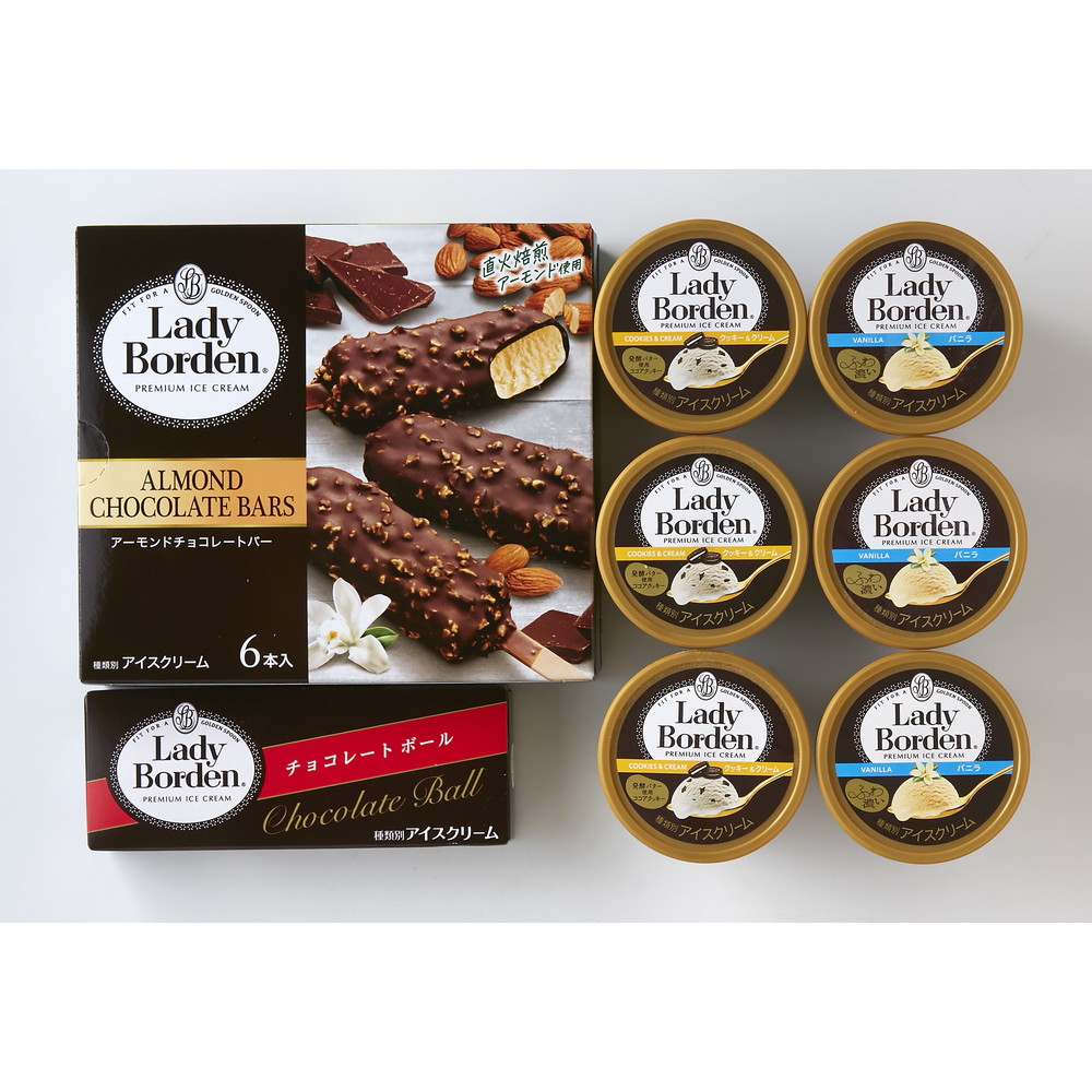 「レディーボーデン」ミニカップ(バニラ・クッキー&クリーム)各120ml×3個、「レディーボーデン」マルチアーモンドチョコレートバー(50ml×6本入)、「レディーボーデン」チョコレートボール(10ml×5個入)